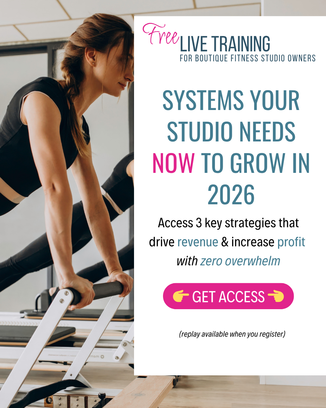 I created this free masterclass to give you clarity, confidence, and a real plan to move your studio forward — so you can earn what you deserve and get back to what you love most: teaching and changing lives through movement.
